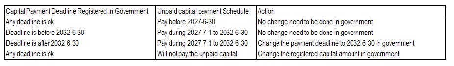 At present, A company registered capital is 1,000,000RMB, already paid 750,000RMB, the unpaid capital is 250,000RMB. If the unpaid capital 250,000RMB shall be paid before June 30th 2027, then no any change needs to be done in the government.